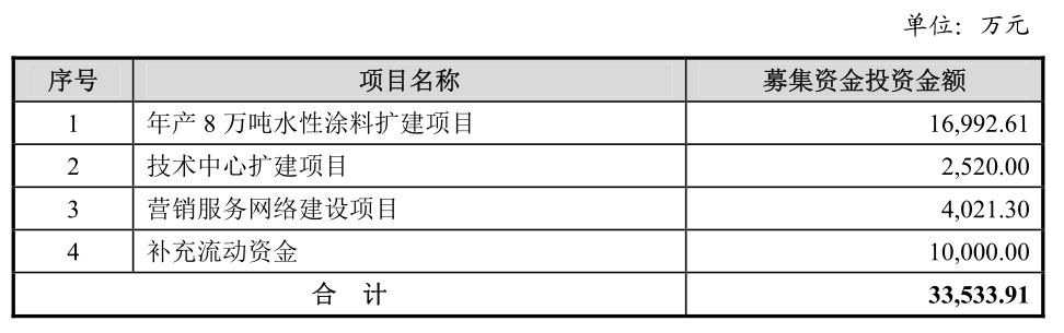 招股书显示,公司募集资金拟投资于年产八万吨水性涂料扩建项目、营销服务网络建设项目、技术中心扩建项目及补充流动资金项目。本次募集资金投资项目围绕公司主营业务进行,目的在于提升公司现有主导产品的生产及销售规模。