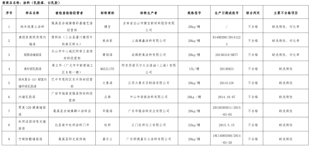 刚刚过去的2015年,涂料行业依然笼罩在质量阴影中。2016年1月19日,涂界记者从四川省工商行政管理局官网获悉,该局公布了涂料(乳胶漆、白乳胶)抽查检验情况,据其公布的资料显示,在抽检产品中,共有29个批次不合格,不合格项目主要集中在对比率、耐洗刷性、不挥发物、压缩剪切强度、游离甲醛等几个方面,其中耐刷洗性、不挥发物是最主要的不合格项。