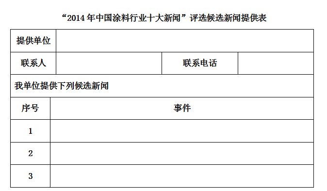 按活动计划,《涂界》杂志社&中国涂界网于即日起面向全行业人士公开征集候选新闻,请您将以下候选新闻提供表于2014年12月31日前传真或发电子邮件至我社。我社联系方式如下:电话/传真:0757-66840566,电子信箱:tujiemedia@163.com。