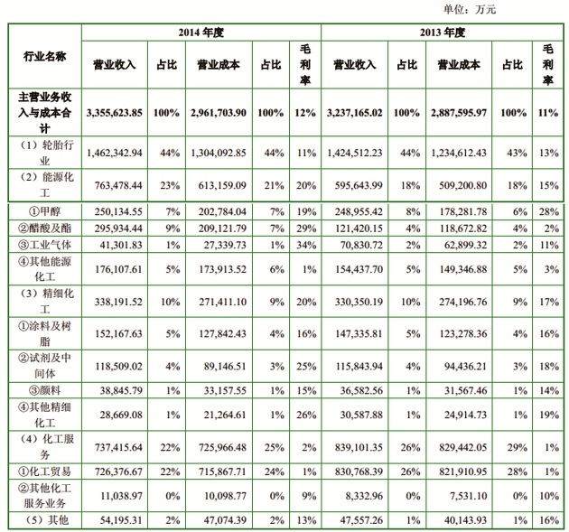 根据公告书显示,双钱股份本次交易后,2014年主营业务收入为3,355,623.85万元,其中轮胎行业营业收入为1,462,342.94万元,占比为44%;能源化工营业收入763,478.44万元,占比23%;精细化工营业收入为338,191.52万元,占比10%;化工服务营业收入为737,415.64万元,占比22%;其他营业收入为54,195.31万元,占比2%。(如下表)