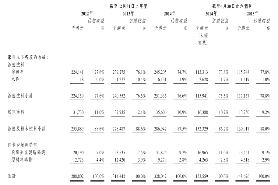 该集团制造多种工业涂料,包括液态涂料(包含各种水性涂料及溶剂型涂料产品,如烘漆、塑料涂料、油墨等)及粉末涂料。往绩记录期内,万辉集团来自(i)销售液态及粉末涂料以及(ii)与联系人卡秀堡辉的两项安排(即转售原材料及松辉委托制造协议)的收益如下: