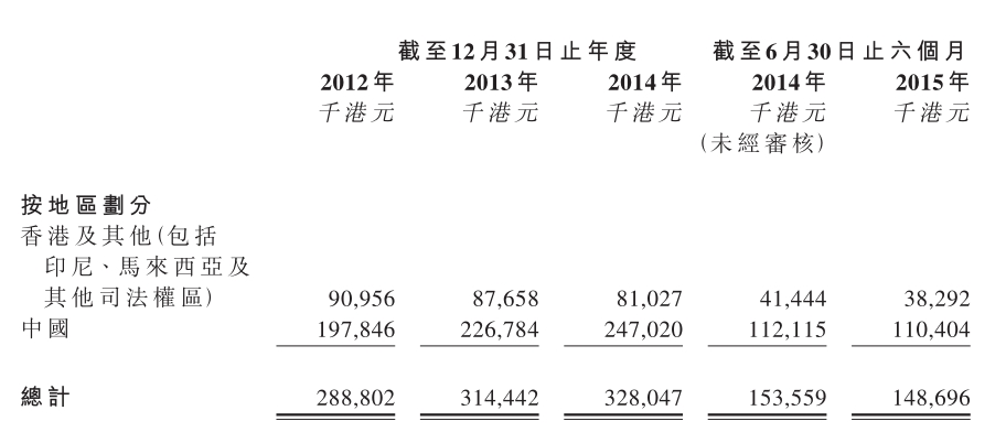 于往绩记录期内,截至2012年、2013年及2014年12月31日止年度以及截至2014年及2015年6月30日止六个月,来自中国客户的收益占总收益约68.5%、72.1%、75.3%、73.0%及74.2%,而来自香港及其他司法权区(如印度尼西亚及马来西亚)客户的收益占总收益约31.5%、27.9%、24.7%、27.0%及25.8%。万辉化工目前在两个分别位于深圳及广州由全资附属公司营运的生产设施,以及另一个位于常州由一家非全资附属公司营运的生产设施进行涂料制造工序。