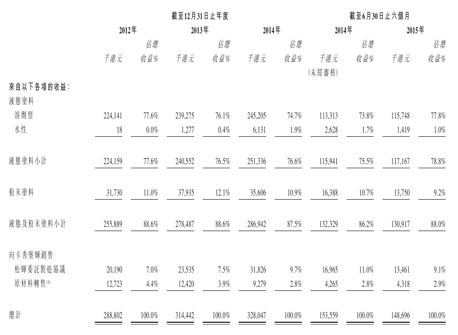 万辉化工表示,随着对我们涂料产品的需求上升及来自卡秀堡辉的收益增加,我们于截至2013年12月31日止年度的收益大幅增加。与此同时,盈利能力与收益及毛利率同步增长。截至2014年12月31日止年度,我们的收益较上一个相应期间有所增加,乃受液态涂料收益增加所带动。收益由截至2014年6月30日止六个月约153.6百万港元微跌 约3.2%至截至2015年6月30日止六个月约148.7百万港元。收益减少主要由于松辉委托制造协议项下的销量减少约28.8%所带动,据董事所理解,此乃截至2015年6月30日止六个月内,卡秀堡辉根据松辉委托制造协议制造的产品销售放缓所致。