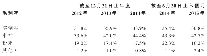截至2012年、2013年及2014年12月31日止年度以及截至2014年及2015年6月30日止六个月,我们的毛利率分别约为26.9%、29.6%、28.2%、29.1%及25.7%。截至2012年12月31日止年度的毛利率低,主要由于中国的劳工成本及福利增加。本集团实施一连串成本控制措施后,毛利率于2013年回弹。本集团于截至2014年12月31日止年度的毛利率录得轻微跌幅,主要由于源辉于2014年投运,进一步增加人手,从而使劳工成本增加。毛利率于截至2015年6月30日止六个月下跌至约25.7%,主要原因为源辉于2014年启用生产设施致使所需劳工成本上升,以及自2015年2月起向涂料产品征收消费税所致。