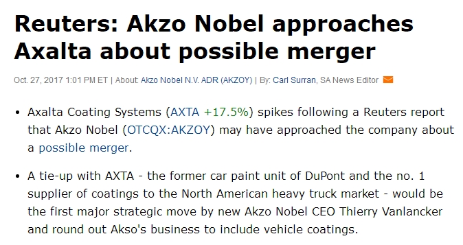 涂界记者注意到,Harold Goldmeier博士此前在网站上发表的一篇题为“Invest In Paint's New Kid Axalta”文章中称,“艾仕得最大的潜力可能是像SHW和PPG这样的买家。或者可以轻松地将艾仕得产品和操作重组到其操作中。当凯雷集团认为出售其股份时,阿克苏诺贝尔被怀疑是艾仕得的严重竞争者。传闻阿克苏诺贝尔正在寻找收购来创造收入,而艾仕得很好地适应了阿克苏诺贝尔的组合。”