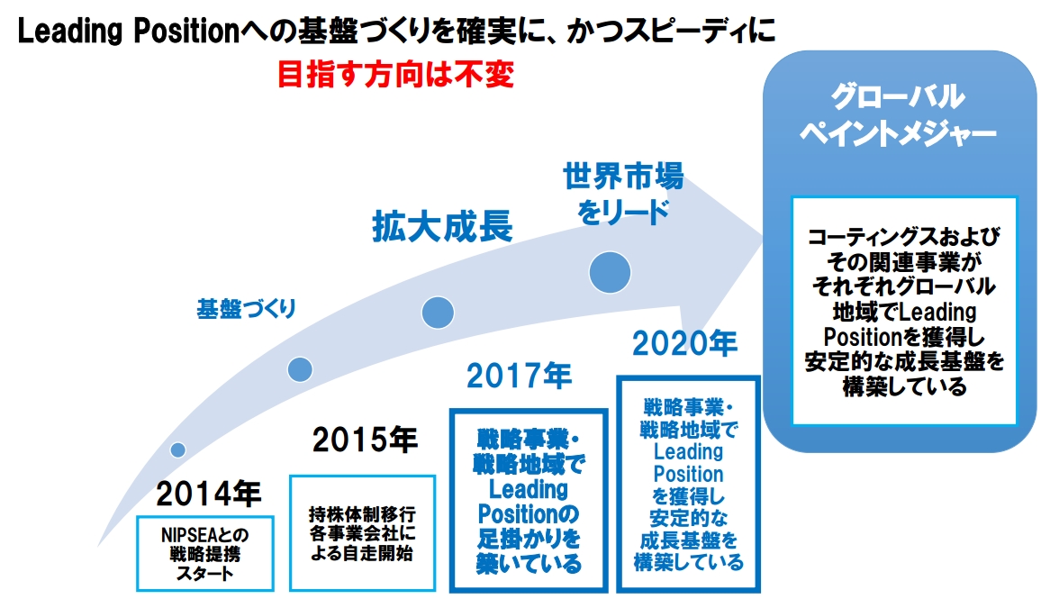 立邦目标:2017财年之前实现销售额和营业利润的扩张,奠定成为世界领先涂料生产商的基础;2018财年及以后,正式达到世界领先水平,成为全球涂料市场的主力军。目标是在中期内实现1万亿日元(约合89.6亿美元)的销售额。