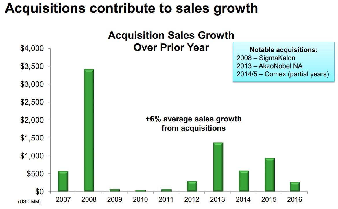 涂界记者发现,自1997年以来,PPG累计进行了超过45次并购,其中大型并购包括:2008年收购SigmaKalon,2013年收购阿克苏诺贝尔北美建筑涂料业务,2014年/15年收购Comex等。收购带来的销售增长达6%。