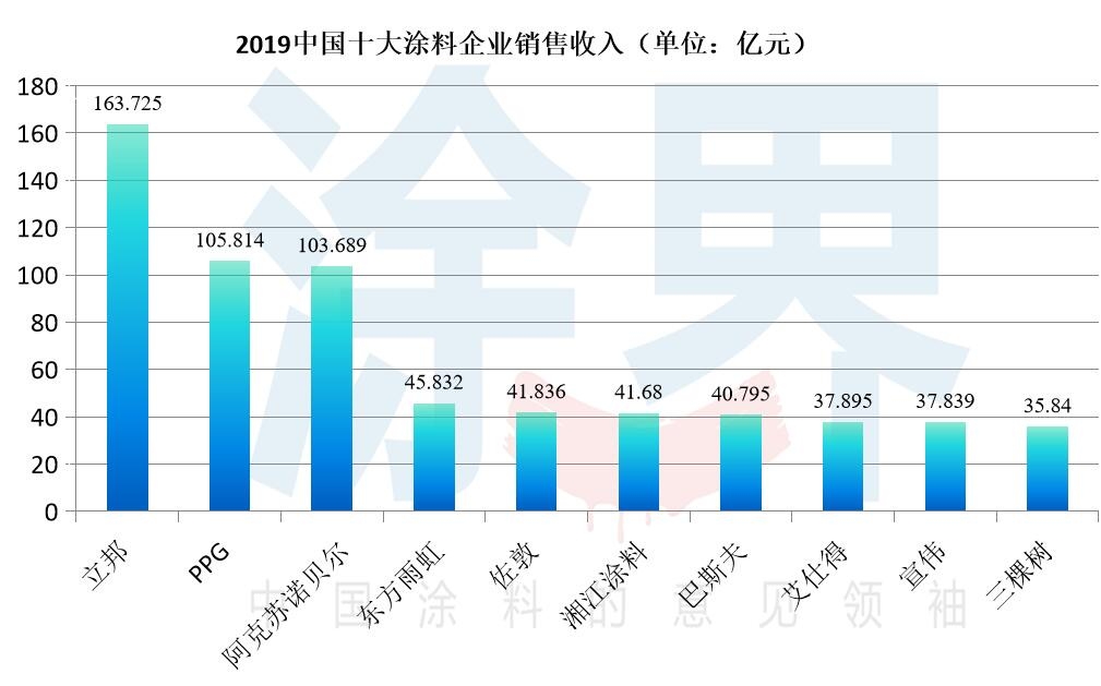 榜单显示,立邦以163.725亿元销售收入蝉联榜首,这也是立邦连续五年位居榜首。PPG、阿克苏诺贝尔分别以105.814亿元、103.689亿元的销售收入位居榜单第二、三位,但销售收入较往年均有所下滑;值得一提的是,PPG首次超越阿克苏诺贝尔,因此排名发生了对调。