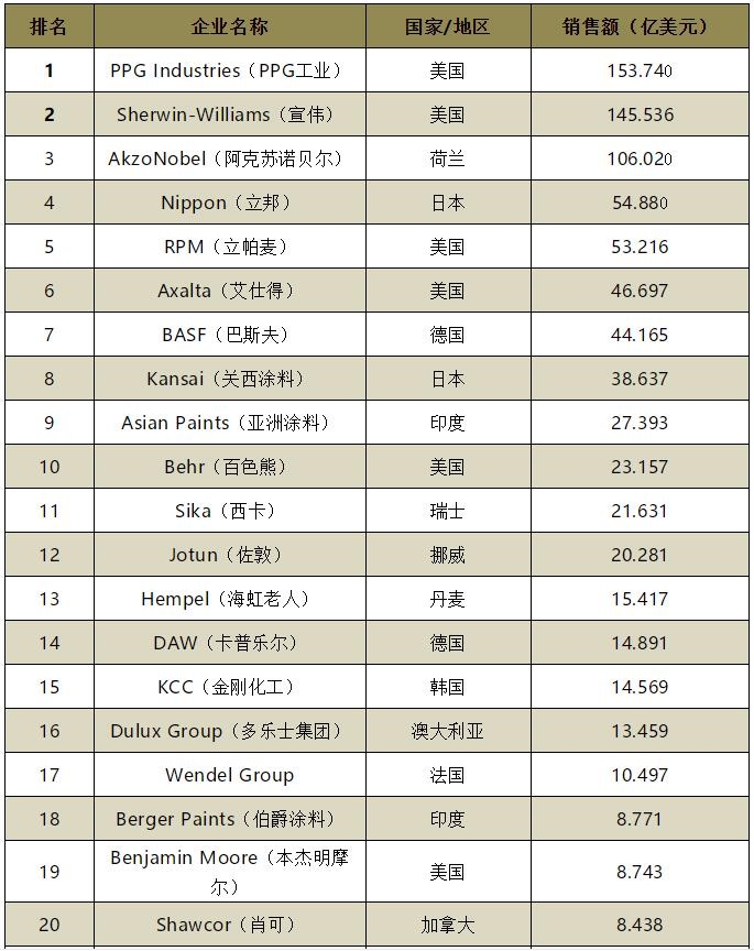 榜单显示,PPG工业以153.74亿美元的营收居全球首位,这是该公司第五次在排行榜上位居首位;宣伟(Sherwin-Williams)则以145.536亿美元营收位列全球第二;阿克苏诺贝尔(AkzoNobel)继续保持全球前三,以106.02亿美元抢得榜眼位置;