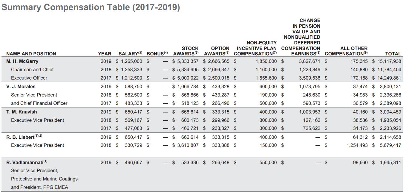 涂界记者根据PPG最新披露的高管薪酬情况了解到,PPG董事长兼首席执行官M. H. McGarry去年的薪酬总额是1511.7938万美元(约合人民币1.055亿元),上一年度薪酬总额为1178.4404万美元,其中:基本工资126.5万美元,股票奖励533.34万美元,期权奖励266.66万美元,非股权激励计划薪酬185万美元,养老金和递延薪酬收入382.77万美元,所有其他的补偿17.53万美元。