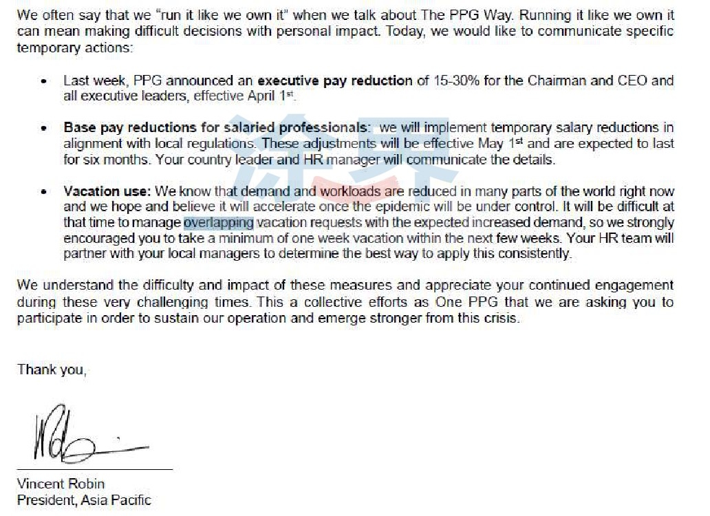涂界记者了解到,这个临时行动包括:上周,PPG宣布Chaiman和首席执行官以及所有高管薪酬减少15%-30%,该调整于4月1日起生效;受薪专业人员的薪酬削减:PPG将根据当地条例实施临时减薪,这些调整将于5月1日起生效,预计将持续6个月。