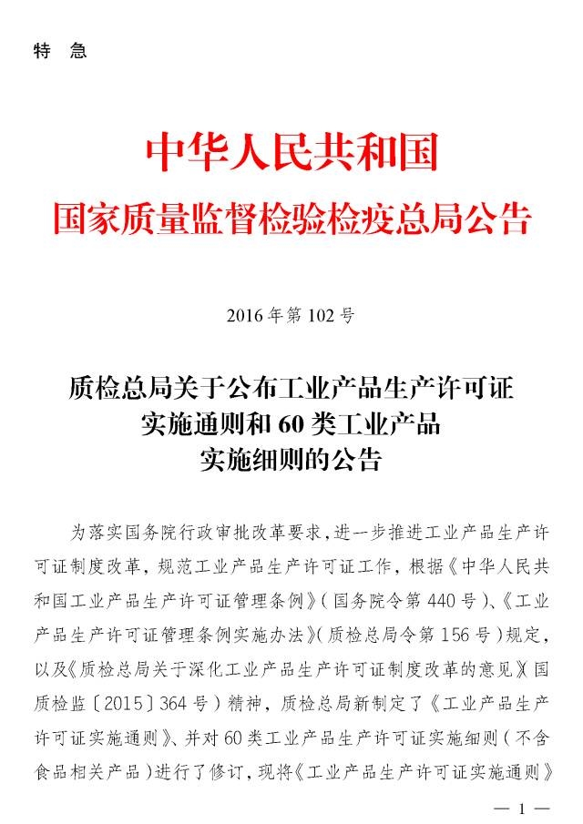 记者从国家质检总局官网了解到,国家质量监督检验检疫总局于2016年9月30日发布了《质检总局关于公布工业产品生产许可证实施通则和60类工业产品实施细则的公告》(2016年第102号)。