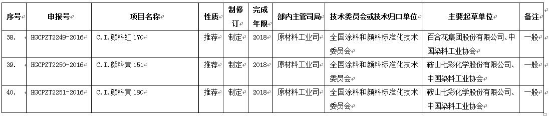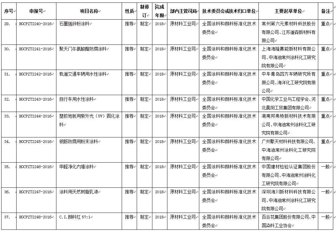 涂界记者发现,石墨烯锌粉涂料、聚天门冬氨酸酯防腐涂料、轨道交通车辆用水性涂料、自行车用水性涂料、塑胶地板用紫外光(UV)固化涂料、钢筋防腐用粉末涂料、甲醛净化内墙涂料、涂料用天然树脂乳液等8项涂料行业标准将要制定,计划于2018年完成。此外,4项颜料行业标准和1项“复层建筑涂料应用技术规程”行业标准也将要制定。