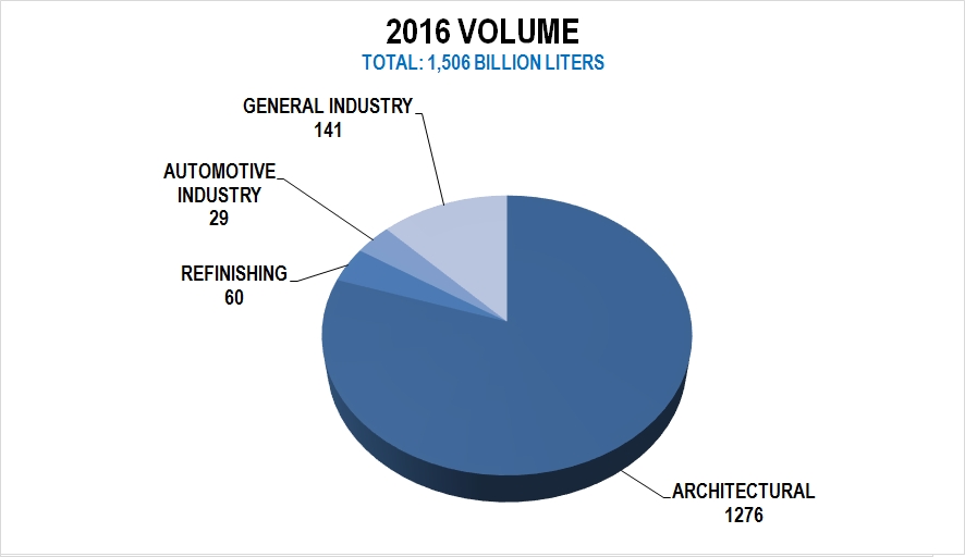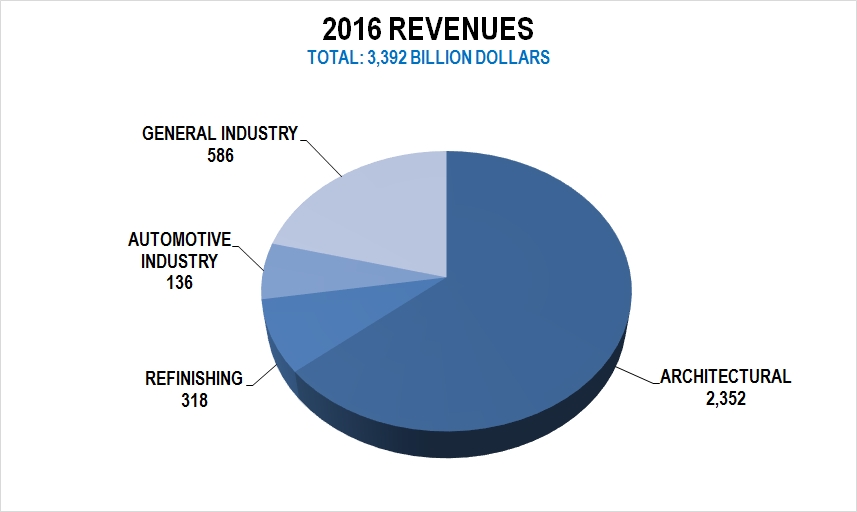 资料显示,巴西2016年建筑涂料占总量的84.7%,占总收入的69%;汽车涂料(OEM)占总量的1.9%,占总收入的4%;汽车修补漆占总量的4%,占总收入的9.3%;一般制造业(家电,家具,汽车零部件,船舶,飞机,维修涂料等)的涂料占总量的9.3%,占总收入的17.3%。(涂界)
