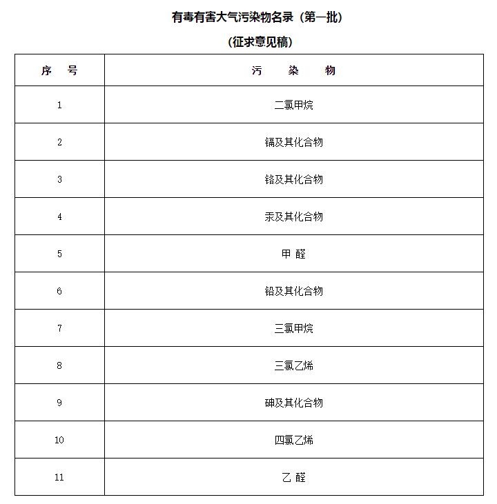 12月13日,生态环境部公布了《有毒有害大气污染物名录(第一批)(征求意见稿)》(以下简称《大气名录》)。《大气名录》显示,甲醛以及镉及其化合物、铬及其化合物、汞及其化合物、铅及其化合物、砷及其化合物等被纳入其中。