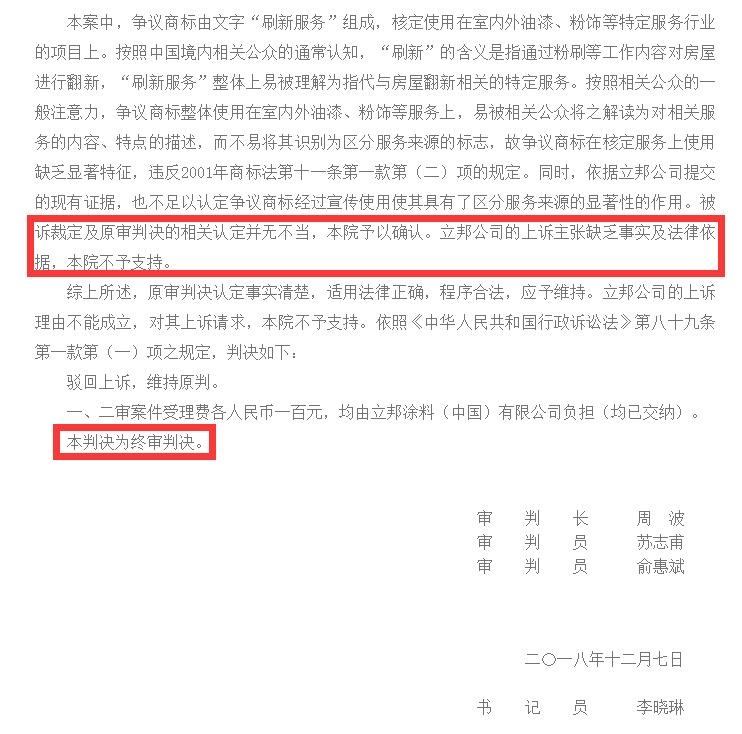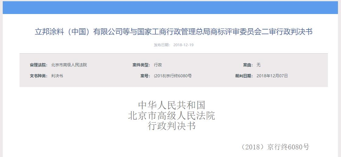 12月19日,北京市高级人民法院官网公布了《立邦涂料(中国)有限公司等与国家工商行政管理总局商标评审委员会二审行政判决书<(2018)京行终6080号>》(以下简称《判决书》)。根据《判决书》来看,立邦涂料“刷新服务”商标案二审败诉。涂界记者注意到,该判决裁判日期为2018年12月07日,而且本判决为终审判决。