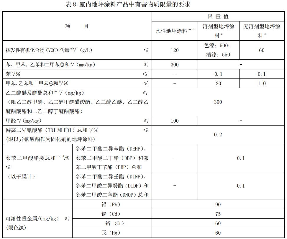 资料显示,《室内地坪涂料中有害物质限量》是首次在国内制定室内地坪涂料强制性标准,该标准发布实施后,涉及其他相关标准的替代和废止。该标准是对涂装在水泥砂浆、混凝土、石材、塑胶或钢材等地坪基面上、对地面起装饰和防护作用以及特殊功能作用的各类室内用地坪涂料中的有害物质进行了限量规定,其目的是为了保护人身健康、减少室内空气污染,因此标准属性为强制性标准。