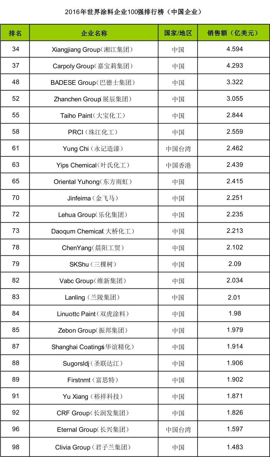 2016年全球顶级涂料企业排行榜出炉 为何仅有3家中国企业入选?