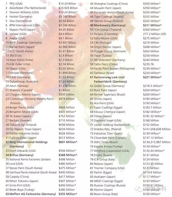 注:排行基于2015财年涂料、黏合剂、密封剂等相关业务的销售业绩,以美元结算。美国以外公司的销售额依据该公司本财年结束日期的汇率折算成美元。对于私人持有的公司未公布销售数字,由Coatings World准确估算,以*标注。上榜87家公司年销售额均超过1亿美元。