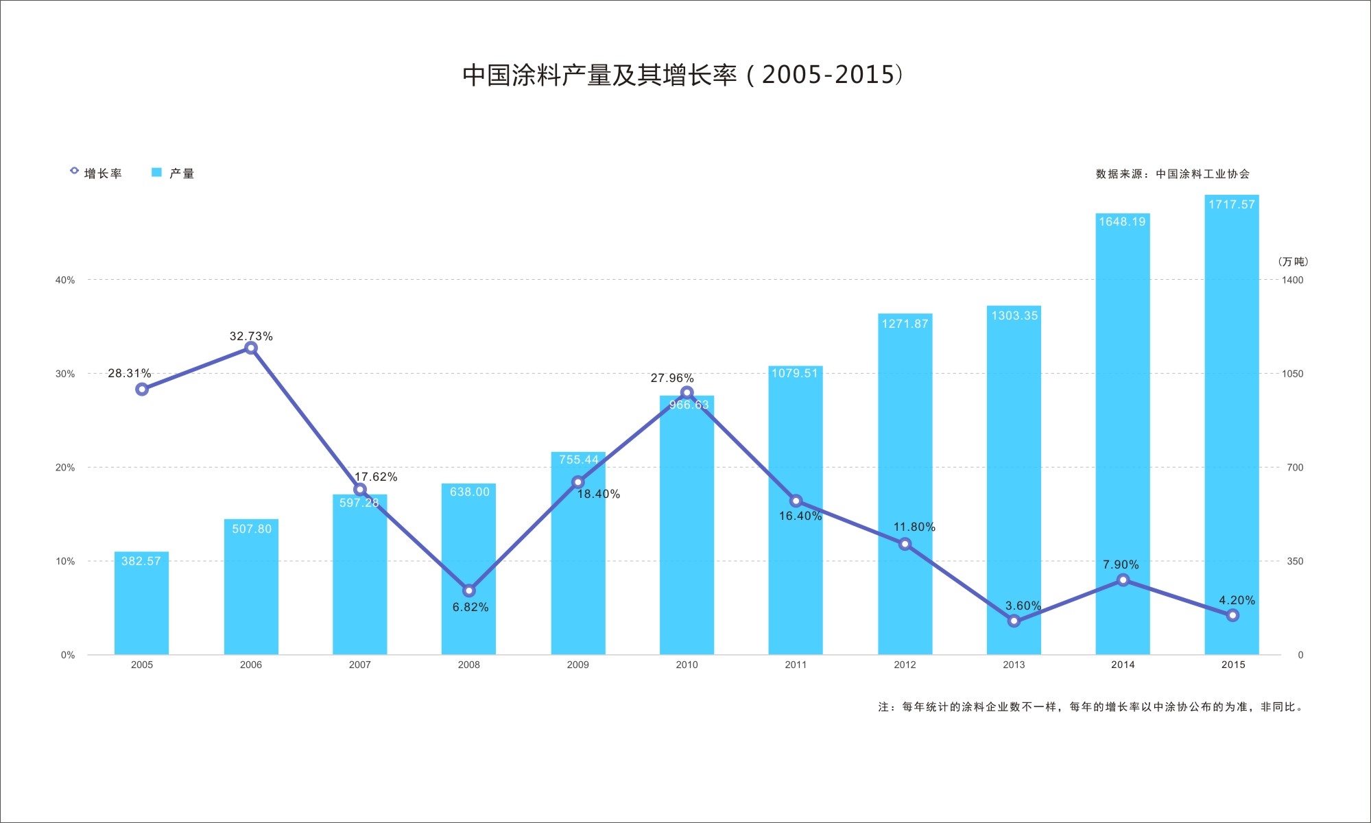 根据统计局数据,2015年我国石油和化工行业增加值同比增长8.7%;实现主营业务收入13.35万亿元,下降5.5%;利润总额6440亿元,降幅19.5%。其中,2015年我国涂料产业实现总产量1717.57万吨,同比增长4.2%;主营业务收入4184.84亿元,同比增长7.30%。涂料营收占石化行业比例为3.13%。