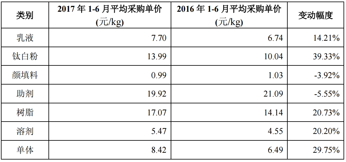 三棵树主要的原材料采购价格变动情况