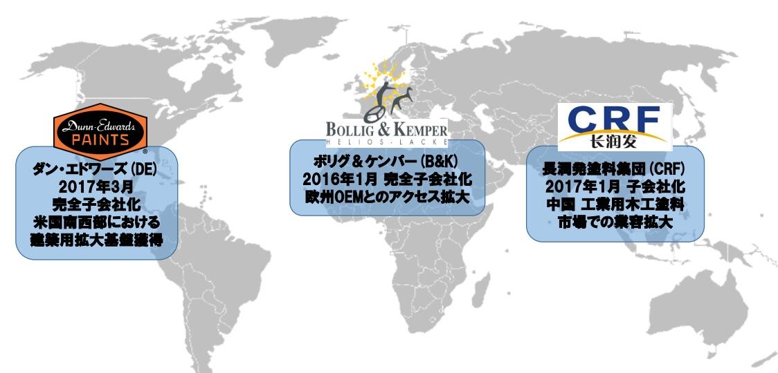 “一家企业要做大做强,无非有两个模式,一是靠自身内源式成长,二是通过并购跨越式发展。”李明月表示,“从全球几大涂料巨头发展轨迹来看,做大做强,全球化布局,主要还是靠并购来完成。今年发生的几次计划并购就是如此。”