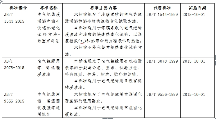 4月30日,工业和信息化部公布了876项行业标准,其中包括《电气绝缘用漆 有机硅浸渍漆》、《渍漆和漆布快速热老化试验方法-热重点斜法》、《电气绝缘用漆 常温固化覆盖漆通用规范》三项标准,并将于10月1日起实施。