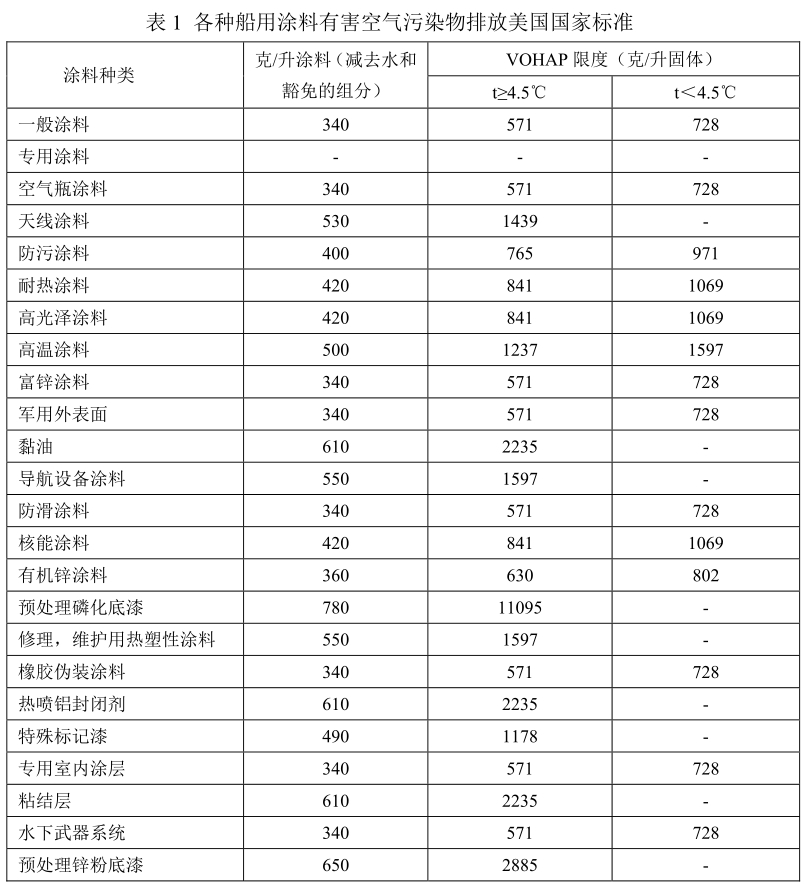标准中对用于造船设施23种涂料的VOHAP含量制订了限值,为每单位体积的涂料减去水和减去(豁免)几乎不会进行光化学反应的成份VOHAP的质量来表示的。