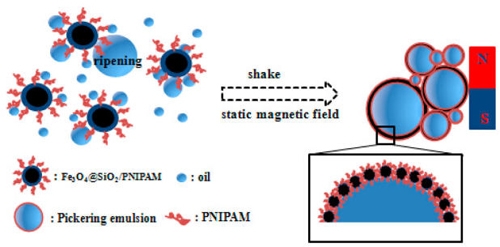 与重力驱动油水分离不同,该聚合物刷接枝磁性复合微粒可作为固体稳定剂扩散到油水界面区域,通过体积排阻作用将油水直接接触界面最小化。同时,在外部磁场作用下,可轻易将皮克林乳液从油水混合物中分离。当乳液从室温加热到PNIPAM的相转变温度(35℃)以上时,PNIPAM的润湿特性发生转变,使皮克林乳液失去稳定性,从而释放油。研究人员以甲苯/水等微乳液为例,使用该材料实现了较高的油水分离效率,且经过多次循环利用后,复合微粒仍能保持较高的分离效率。