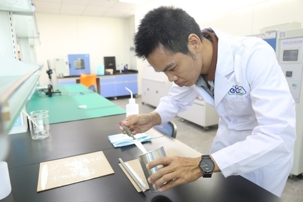 在易必固新组建不久的实验室里,工作人员在一块玻璃上均匀抹上一层液态的白色涂料,随后放入电子加速器中,转眼功夫后取出,玻璃表面的液体已经完全固化,看起来与玻璃浑然一体,用手触摸清冷光滑。