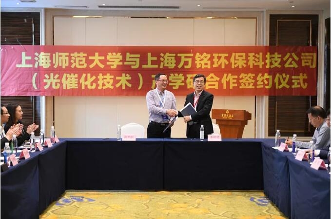 会上,上海师范大学教育部资源化学国际合作实验室与上海万铭环保科技有限公司签署了产学研合作,双方将共同实现光催化技术的科技创新、人才培养和产业推进,为国家绿色环保事业贡献力量。