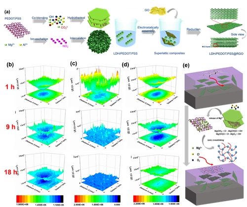 该涂层采用旋涂技术,可在金属材料表面涂覆,涂层防腐效果明显,物理化学性能稳定。涂层修复剂采用层状双金属氢氧化物(LDH)将分子体积小的可溶性导电聚合物聚(3,4-乙烯二氧噻吩)-聚苯乙烯磺酸(PEDOT/PSS)固定在层间,同时与石墨烯进行静电组装,提高石墨烯的灵活性与分散性。