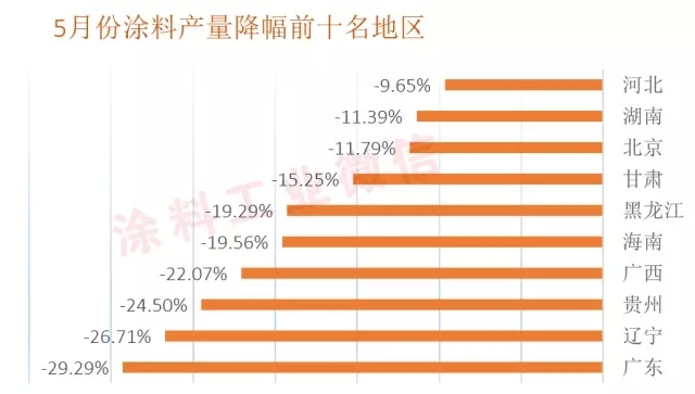 从全国各地区的涂料产量变化情况来看,2015年5月份仍有10个省份均出现了10%以上(含)的下滑。涂料第一大省广东的涂料产量下滑幅度最大,达到29.29%,涂料大省湖南和河北也分别出现了11.39%和9.65%的降幅,整体形势堪忧。