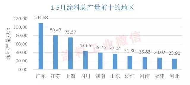 较为乐观的是,江苏省5月份涂料产量实现了20.57%的增长;上海则转负为正,5月份产量实现5.69%的同比增幅;安徽和四川表现较为突出,5月份增幅达58.93%和31.52%。此外,山东、河南、福建在5月份分别实现了4.56%、23.27%和20.88%的同比增幅,位列涂料生产总量排名的第二梯队。