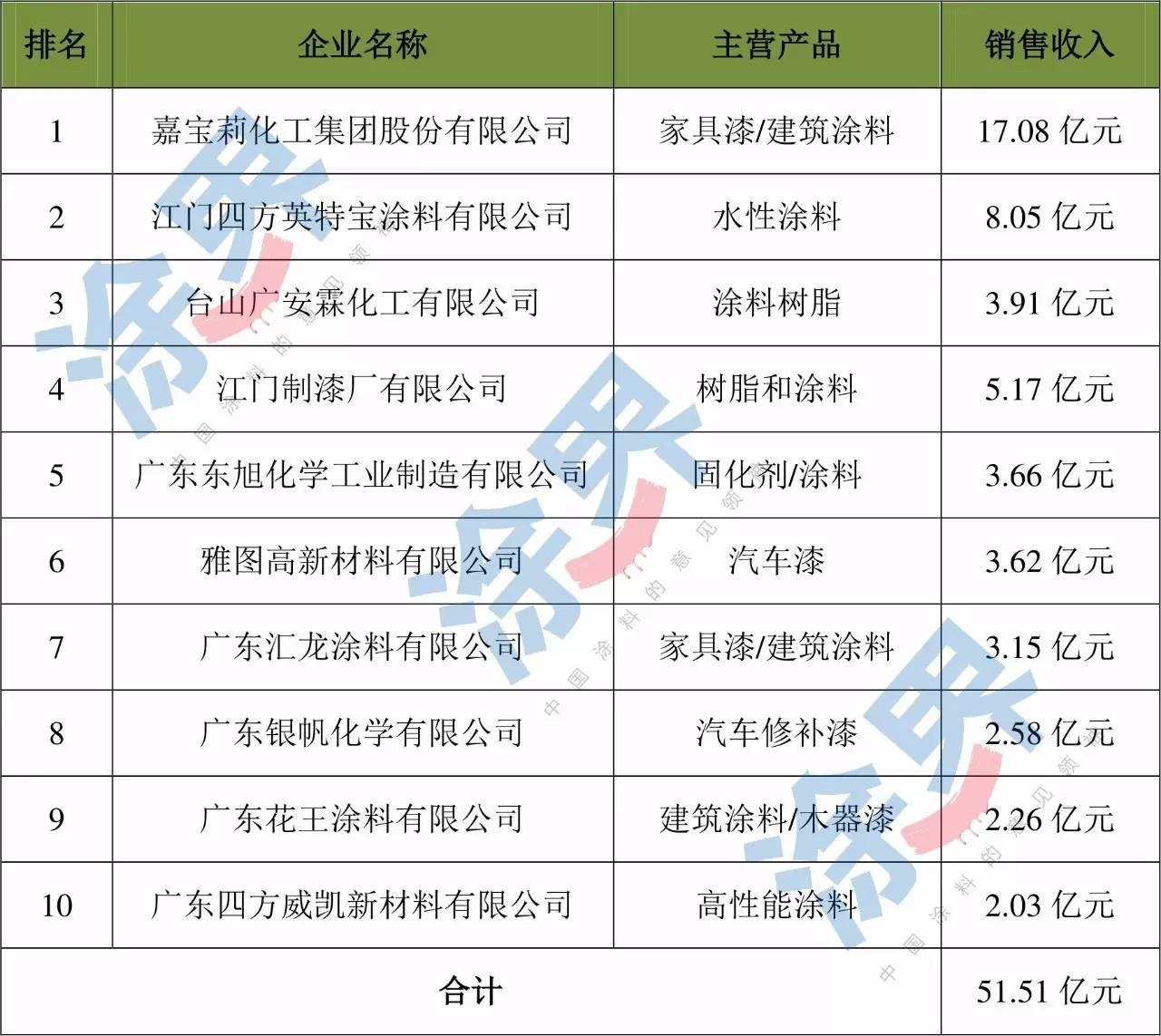 根据《涂界》去年发布的“2015年江门市涂料企业TOP 10榜单”显示,嘉宝莉、四方英特宝、广安霖、江门制漆、东旭化学、雅图高新材料、汇龙涂料、银帆化学、花王涂料、四方威凯10家涂料企业2015年总销售收入为51.51亿元。