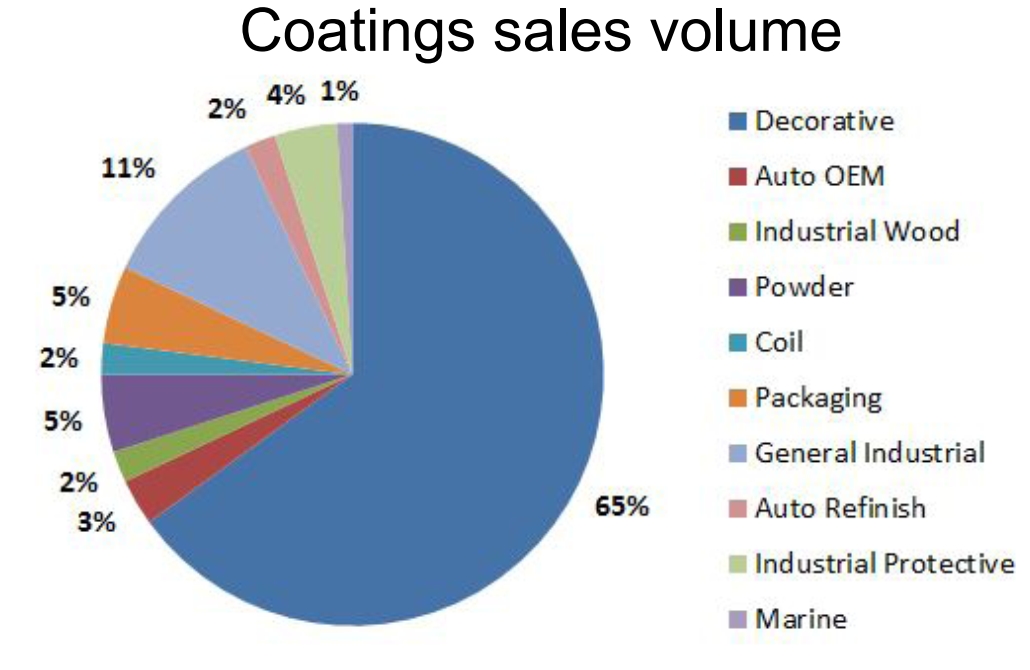 资料显示,在英国涂料行业中,装饰涂料产量占比为65%,一般工业涂料占比为11%,包装涂料占比为5%,粉末涂料占比为5%,工业木器漆(家具漆)占比为4%,汽车OEM涂料占比为3%,汽车修补漆占比为2%,绝缘涂料占比为2%,工业防护涂料占比为2%,船舶涂料占比为1%。