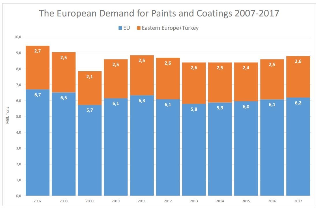 2017年欧洲地区2007-2017年涂料需求情况