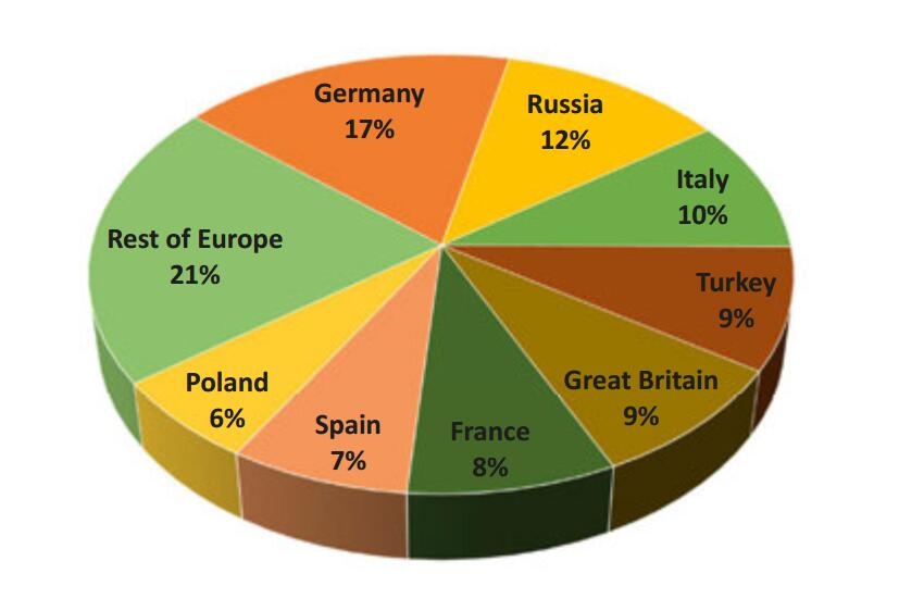 按国家和地区产量占比来看,德国27%,俄罗斯12%,意大利10%,土耳其9%,英国9%,法国8%,西班牙7%,波兰6%,欧洲其他地区21%。