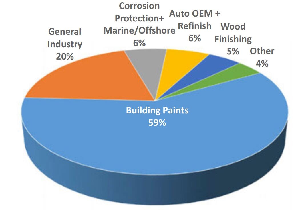 按产品终端应用来看,欧洲地区2017年建筑涂料占比为49%,一般工业涂料占比为20%,防护/船舶/海洋工程涂料占比为6%,汽车OEM涂料/修补漆占比为6%,木器涂料占比为5%,其他占比为4%。
