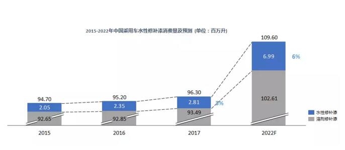 虽然迄今发展相对较缓,但汽车涂料人并没有放弃努力。据统计,2017年水性修补漆的消费虽然仅为2.8百万升,仅占修补漆总消费量的3%,但其增长速度远高于修补漆的速度,而这个增长速度在今后或将有更大的提升。预计,2018年后中国水性修补漆的年均增长率将达到20%,远期来看,水性漆有望实现占修补漆消费量30%的最高占比。