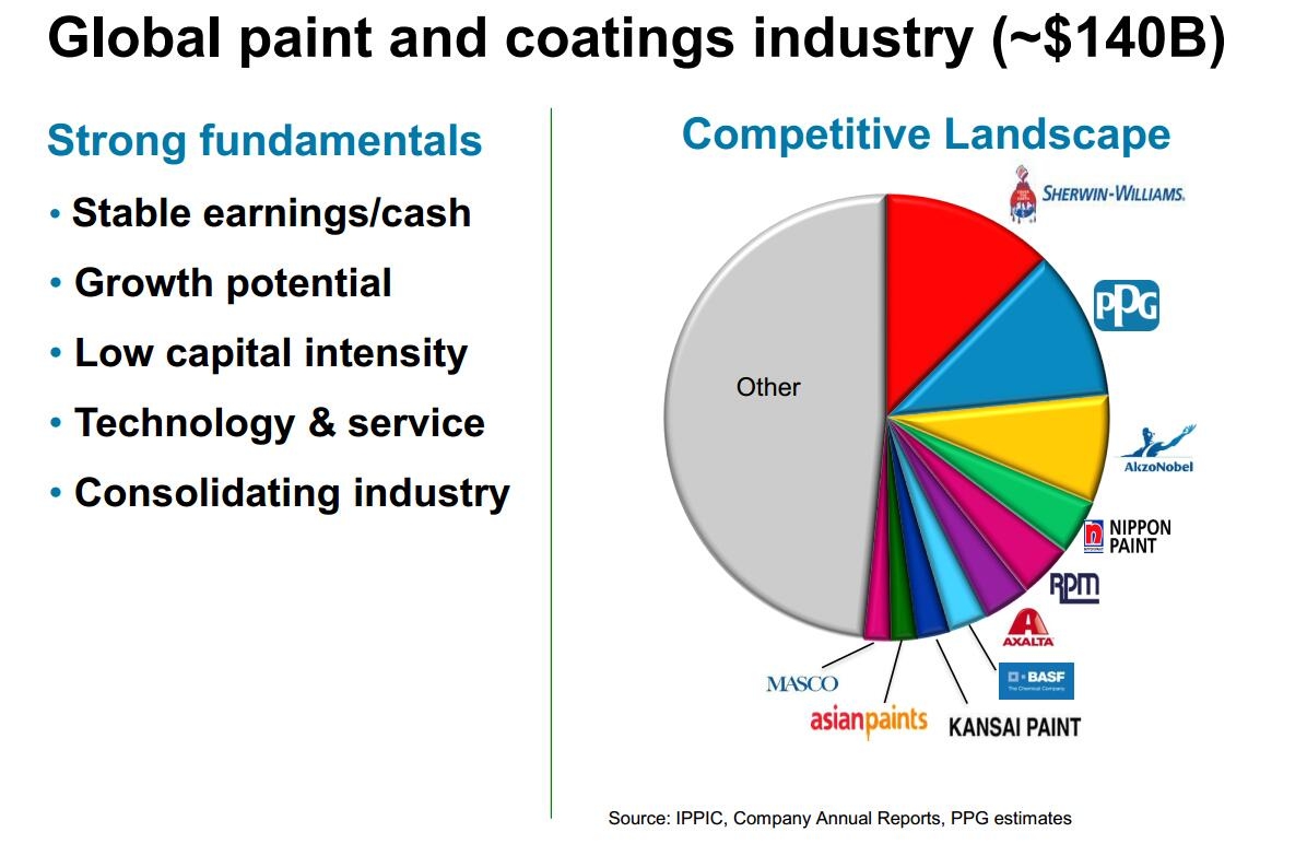 全球涂料行业竞争激烈,PPG工业是全球涂料市场最大的公司之一,宣伟、阿克苏诺贝尔、立邦、立帕麦、艾仕得、巴斯夫、关西涂料、亚洲涂料、百色熊、佐敦、海虹老人、西卡、卡普乐尔、金刚化工等。(涂界)