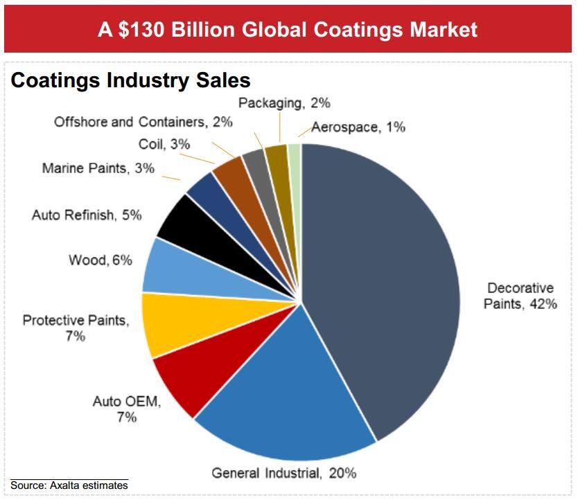 艾仕得(Axalta)在一份报告中预估的数据显示,2018年全球涂料市值约为1300亿美元,其中:2018年装饰涂料占比42%,一般工业涂料占比20%,汽车OEM涂料占比7%,防护涂料占比7%,木器涂料占比6%,汽车修补漆占比5%,船舶涂料占比3%,卷材涂料占比3%,海洋工程和集装箱涂料占比2%,包装涂料占比2%,航空涂料占比1%。