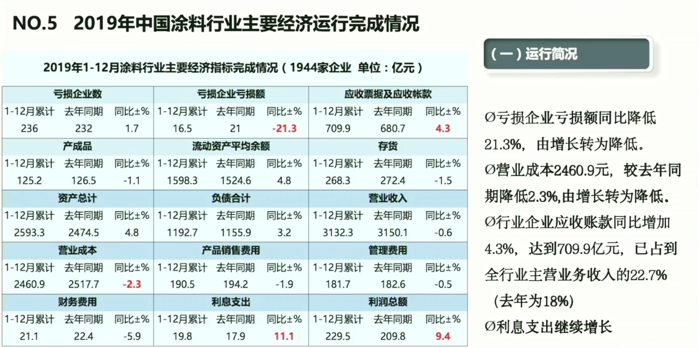 报告显示,全国涂料行业2019年1-12月累计亏损企业数量为236家,同比增长1.7%;亏损企业亏损额为16.5亿元,同比下降21.3%;应收票据及应收账款为709.9亿元,同比增长4.3%。