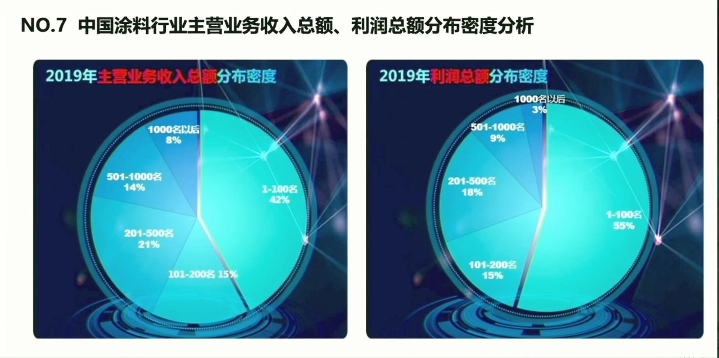 按照2019年全国涂料行业利润总额分布密度来看,位居第1-100名以内的企业累计利润占比为55%,101-200名企业累计利润占比15%,201-500名以内企业累计利润占比为18%,501-1000名以内企业累计利润占比9%,1000名以后企业累计利润占比3%。