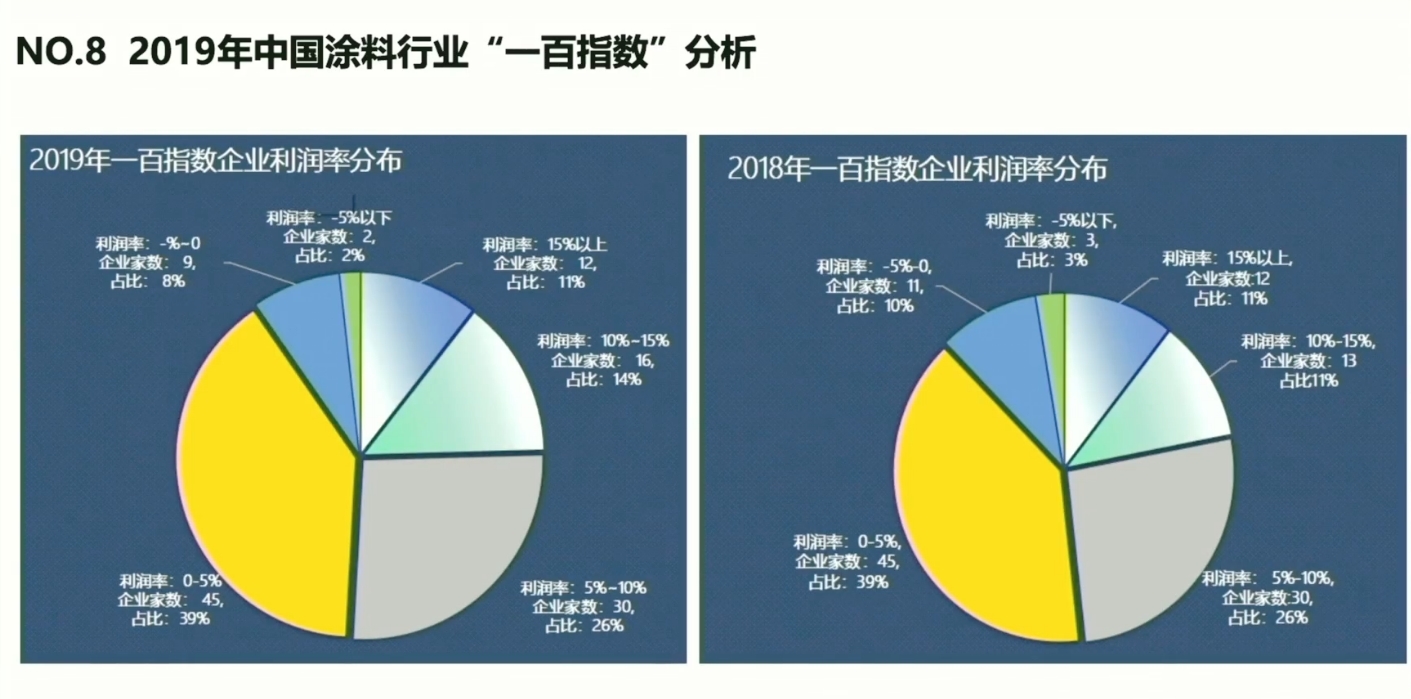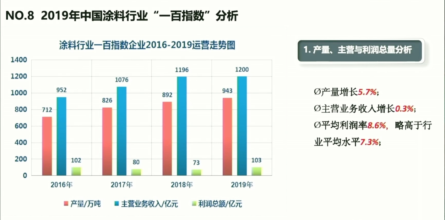 会上,中国涂料工业协会还发布了2019年中国涂料行业“一百指数”。按2019年主营业务收入顺序所选的“一百指数”企业(114家),2019年所选企业总产量为943万吨,同比增长5.7%;所选企业主营业务收入为1200亿元,同比增长0.3%;所选企业利润总额为103亿元,同比增长29.13%。此外,所选百家企业平均利润率为8.6%,略高于行业平均水平7.3%。