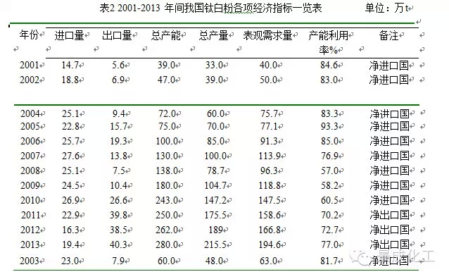 企业对市场的判断失误,片面地追求所谓的规模效益,对市场前景过于乐观。从表2可见,2011年之前我国是钛白粉净进口国,2006年之前产能利用率在80%以上,钛白行业整体销路好,利润空间大。后来除了行业内生产厂家迅速扩能之外,大批外来资本也迅速介入,造成短短几年内大量产能集中建成,但产品大都同质化,难以对进口产品进行实质上的替代,造成产能过剩。