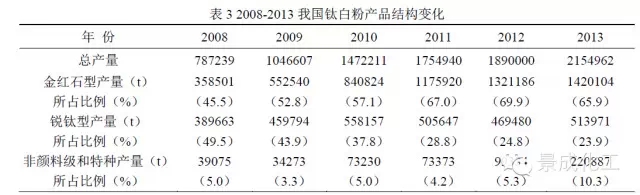 2013年全国金红石型钛白粉产量为1420104t,占总产量的65.9%,比上年下降4个百分点。锐钛型钛白粉为513 971t,占钛白粉总产量的23.9%,比上年下降0.9个百分点。非颜料级和特种钛白为220 887t,占钛白粉总产量的10.3%,比上年增加5个百分点,增幅较大。相比较2012年产品结构,2013年非颜料级和特种钛白产品比例上升。主要原因是国家环保产业政策越来越严格,火电厂脱销项目推进较快,使得脱销钛白市场需求上升,业内随之纷纷调整产品结构,新上脱销钛白生产线,致使非颜料级和特种钛白产量逐步上升,销量也在不断增大。据钛白分中心统计,到2013年底国内已经发展到10家以上脱销钛白粉生产企业,市场环境的变化决定了产品类型的变化。
