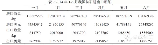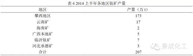 2014上半年国内钛矿产量207万t,比上年同期增长38%;其中攀西地区产量173万t,同比增长37.3%;云南、海南、广西及河北地区产量34万t,同比增长41.67%。加上进口钛矿101万t,上半年我国钛矿表观消费量308万t 左右,比上年同期增长13%。