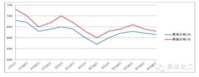 以我国占主导地位的攀枝花地区钛矿分析,1~6月,钛精矿市场价格“先抑后仰”,总体交投并不乐观,价格从年初730元/t 跌至6月底的610元/t(均不含税),跌幅为16.44%;价格极高值为年初的730元/t,价格极低值为4 月中旬的530元/t(均不含税),垂直振幅为27.4%。具体来看,1月市场价格相对平稳。46品位的钛精矿主流成交价在730元/t(不含税)左右,多采取一单一议。攀枝花地区除个别矿商低价走货外,绝大多数矿企停产,整体开工率仅20%左右。进入2 月份,矿企陆续开工,虽然提价欲望强烈,但随着元宵节过后钛白粉市场价格重返下行通道,对钛精矿价格打压严重,市场上利空传闻不断。3月钛精矿市场依旧弱势,受累下游需求疲软与打压,钛精矿价格继续走低,矿商利润缩减严重,多数已经亏损,攀西地区整体开工率在30%左右,多以消化库存为主,出货欲望较强,实单价格协商空间较大。4月钛精矿市场先弱后强。月初,攀枝地区钛矿仍为偏弱,个别小型矿商出现530元/t(不含税)的价格,主流价格在560~580元/t(不含税)之间,随着钛白价格的反弹,中小型矿商价格也出现反弹,幅度在20元/t左右,市场开工率较前期也有所增加。5月随着钛白粉价格的小幅度上行,中小型矿商成交价格较月初有30元/t左右幅度上调,无奈钛白粉生产商均在微利运行,高价原料矿并不被市场接受,随着钛白粉移库效应所致的行情逐步惨淡,矿商对后市比较悲观;到下旬,攀枝花地区持续高温,给矿企作业带来困难,部分企业开始间歇生产。此阶段攀枝花地区46品位钛精矿价格在620~650元/t(不含税)间,较月初最低的610元/t(不含税)上涨6%左右。进入6月,钛白粉虽然价格继续报涨,但国内出货情况并不乐观,钛精矿出货压力也有所增大,价格也出现20元/t 左右的下行,截止6月末,攀西地区钛精矿价格在600~640元/t。