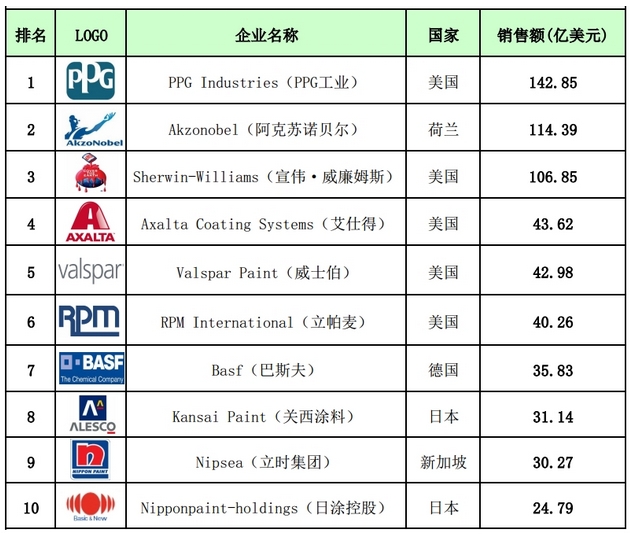 2016年5月16日,国内涂料行业首家财经媒体《涂界》(Coatings Industry)发布了“2016年世界十大涂料制造商排行榜(Top 10 Coatings Manufactrer)”。据悉,该排行榜基于根据全球涂料制造商2015财年(日本涂料企业为2016财年)涂料业务(不含胶粘剂、涂料原料及辅料等业务)的销售业绩的综合排名,纳入排名的涂料制造商全部为上市公司。